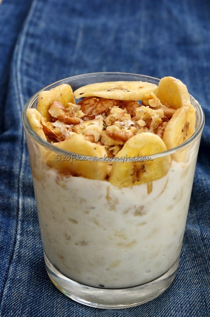 2. Egy üvegpohárba kanalazzuk a banános joghurtot, megszórjuk durvára vágott pirított dióval, a pohár oldalát pedig kirakjuk banánchips-szel.