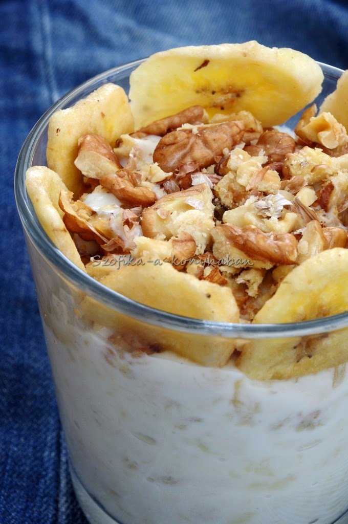 All you need to do is just mash 1 ripe banana with a fork and mix with 100g of natural greek yogurt. Spoon into a glass cup, top with crushed walnuts and banana chips.