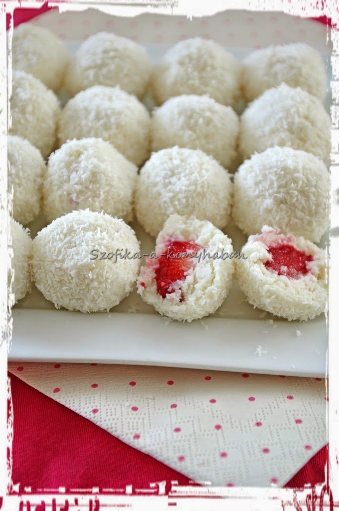2. Golyókat formálunk, a közepükbe 1-1 kis kocka epret nyomunk és kókuszreszelékbe hempergetjük.
