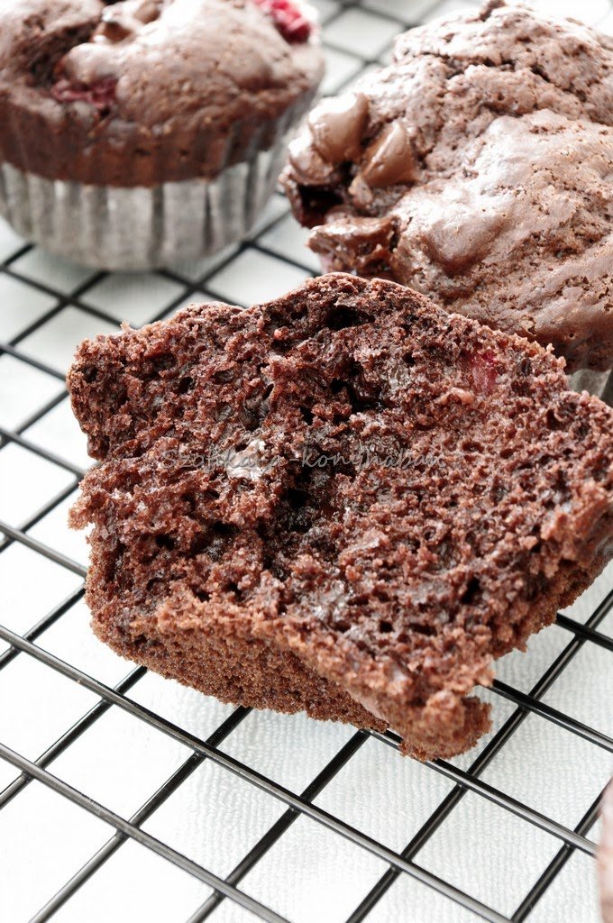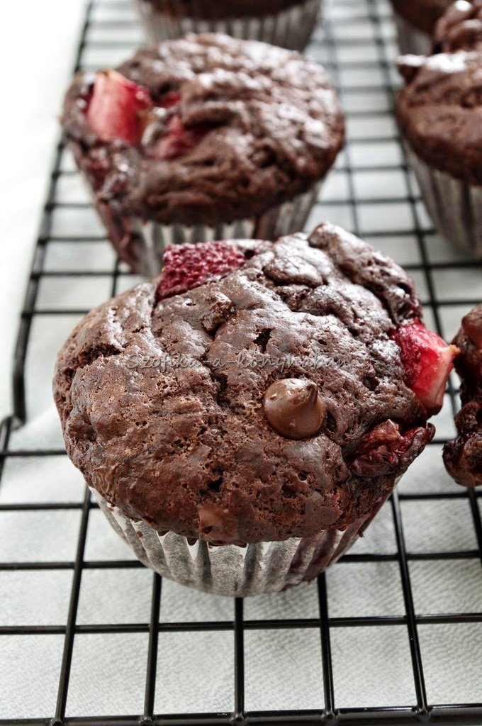 It is simply just the best muffin ever. My husband who doesn’t like chocolate cakes or brownies, ate 4 of them for breakfast. I ate 2, after a generous portion of porridge. The texture is just unbelievable.Soft, fluffy. Oh My…Doesn’t really matter what else you put inside: more chocolate, nuts, spices, raspberries, strawberries-it will be just perfect. This time I tried with fresh strawberries. Recipe adapted from here, however I modified a bit.