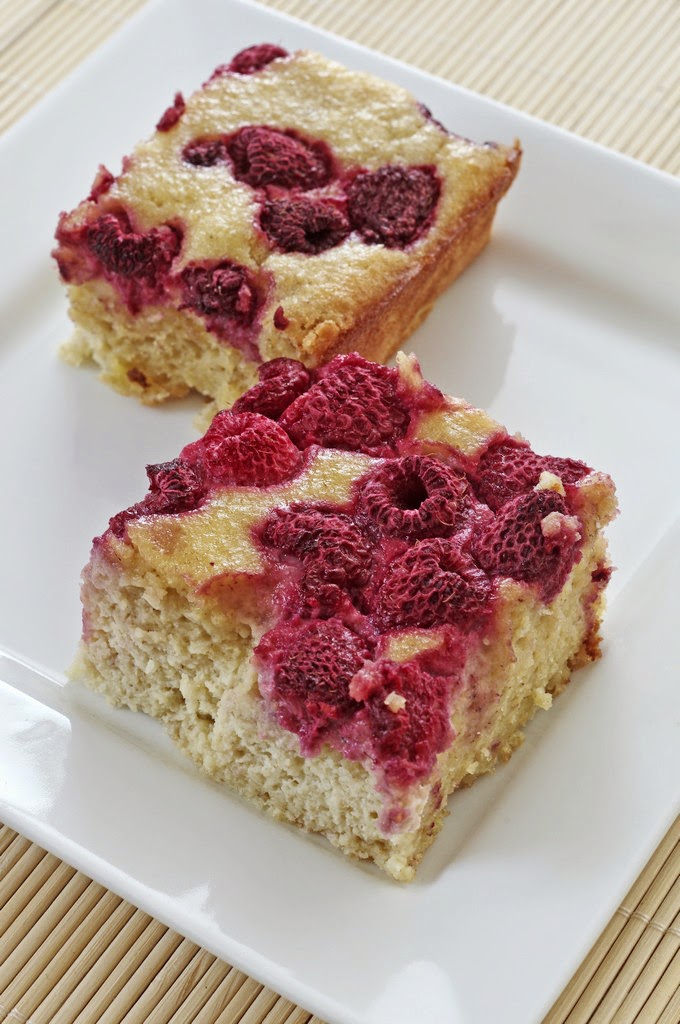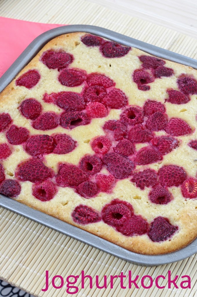 2. Mix the eggs with sugar, add yogurt,oil, finely ground oatmeal and pour into the tin. Top with raspberries and bake for 20-25 mins.