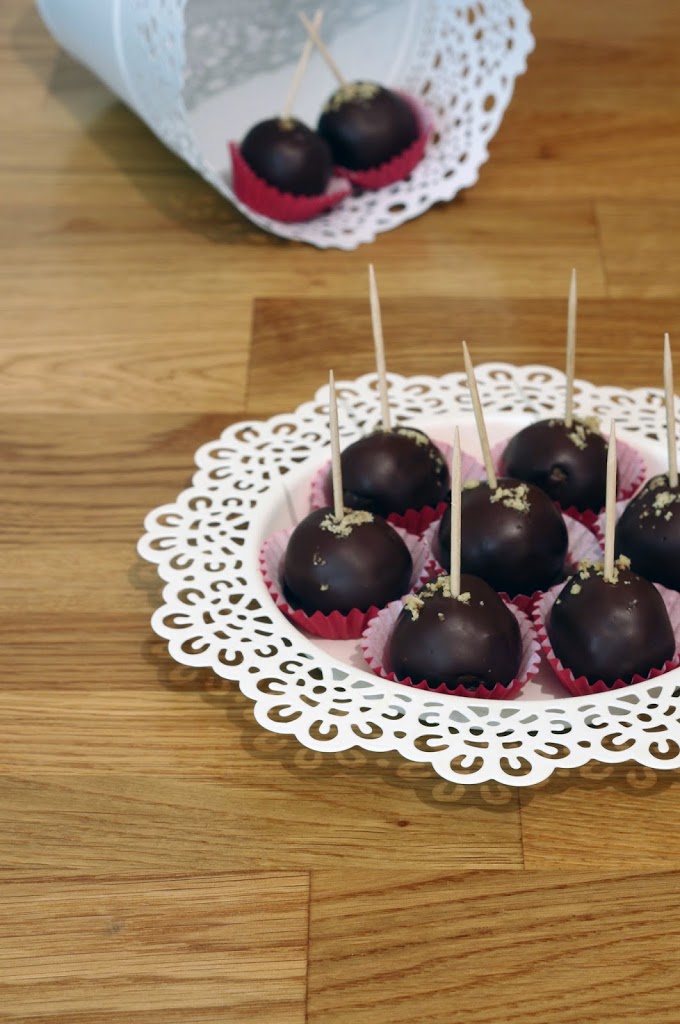 4. A hideg golyókba szúrjunk egy fodpiszkálót, mártsuk meg a csokiban és tegyük őket szilikonos / sütőpapírra száradni. Pici darált dióval szórjuk meg a tetejüket.