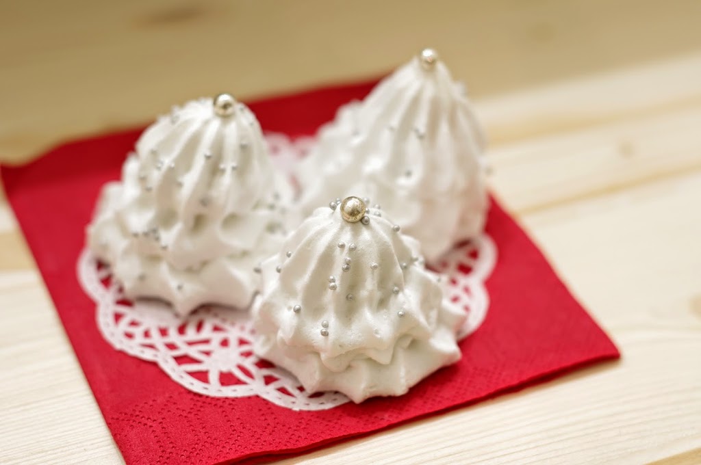 4. Töltsük csillagcsőrrel ellátott habzsákba a habot és 3 adagot nyomjunk egymás tetejére a sütőpapírra: az első nagyobb, a középső kisebb, a felső egészen pici legyen. Oldalukat szórjuk meg apró ezüst cukorgyönggyel, tetejükre 1 nagyobbacskát nyomjunk.