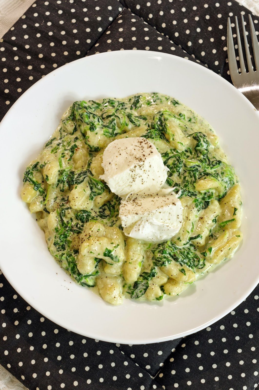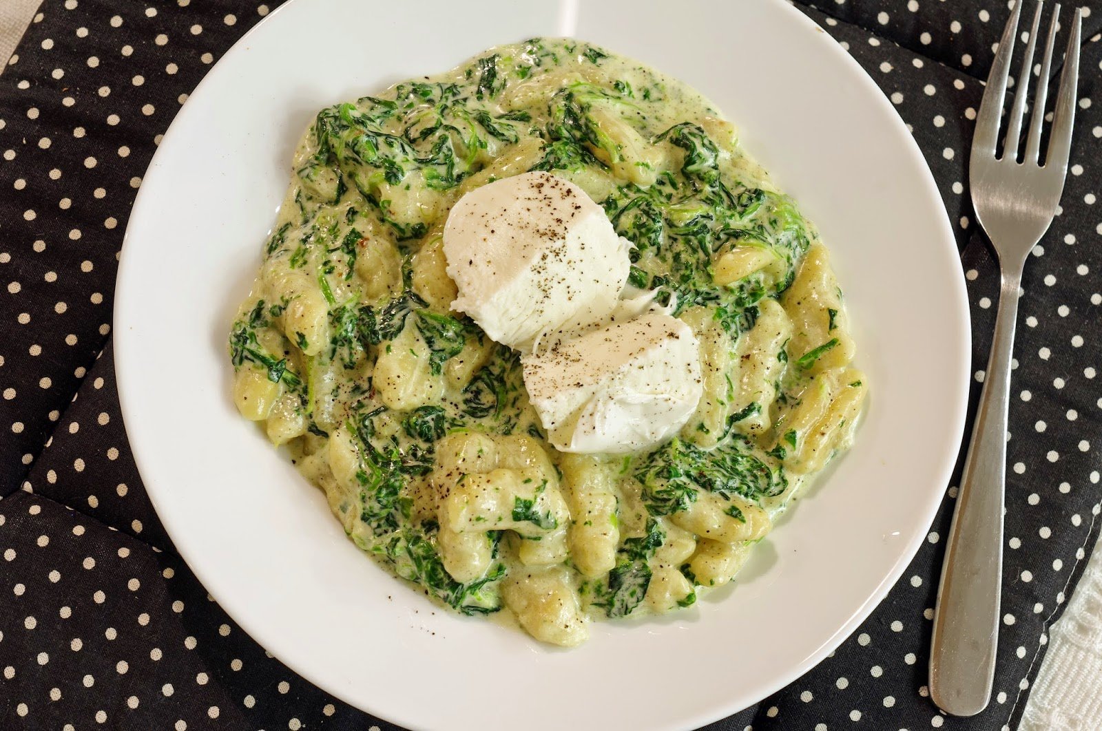 3. Egy széles lábasban felhevítjük a tejszínt, annyi parmezánt reszelünk bele, hogy sűrű szószt kapjunk. Sózzuk, borsozzuk, hozzáadjuk a spenótot majd a gnocchit.