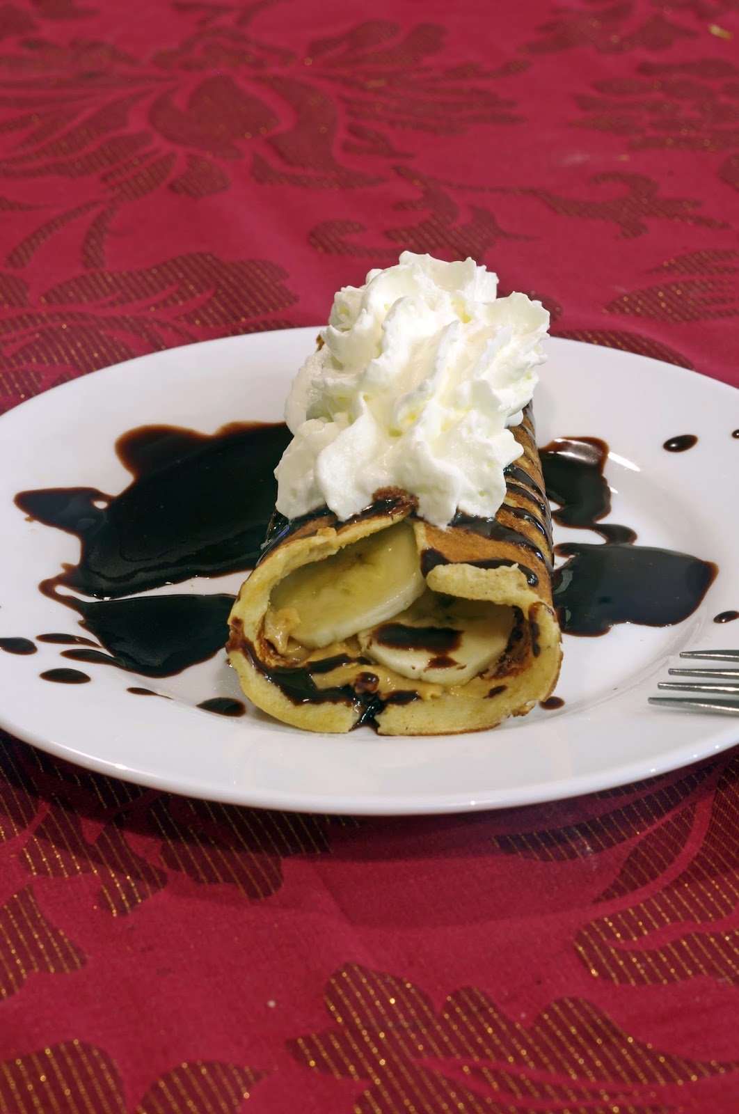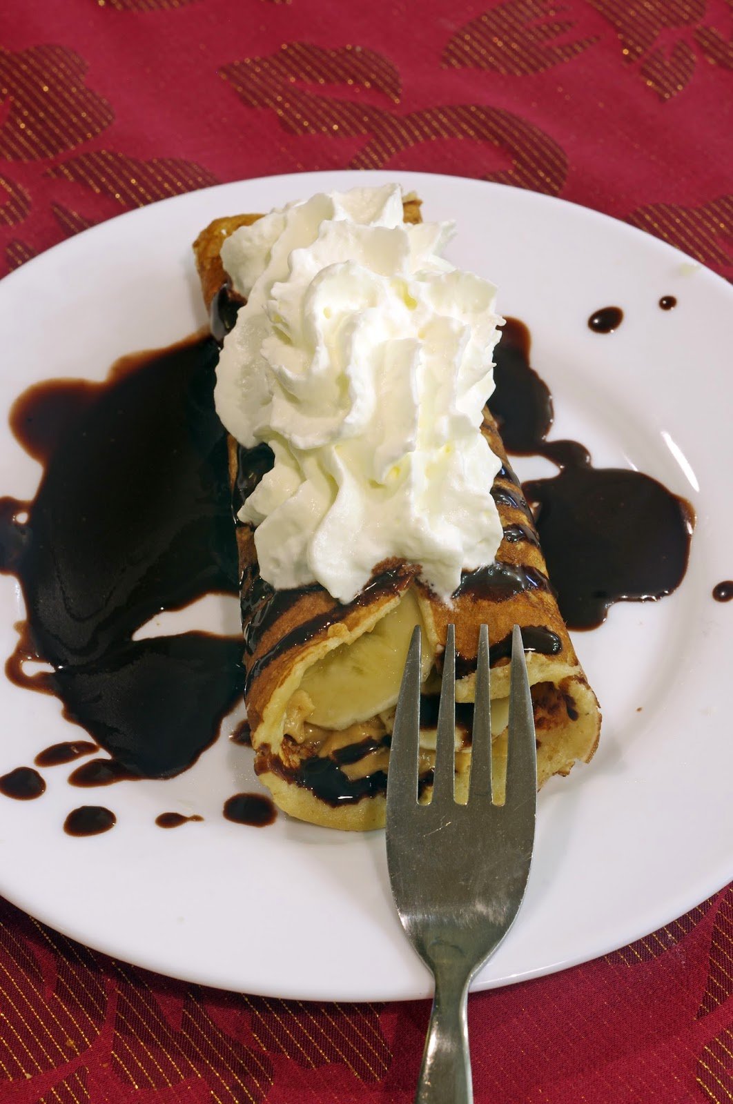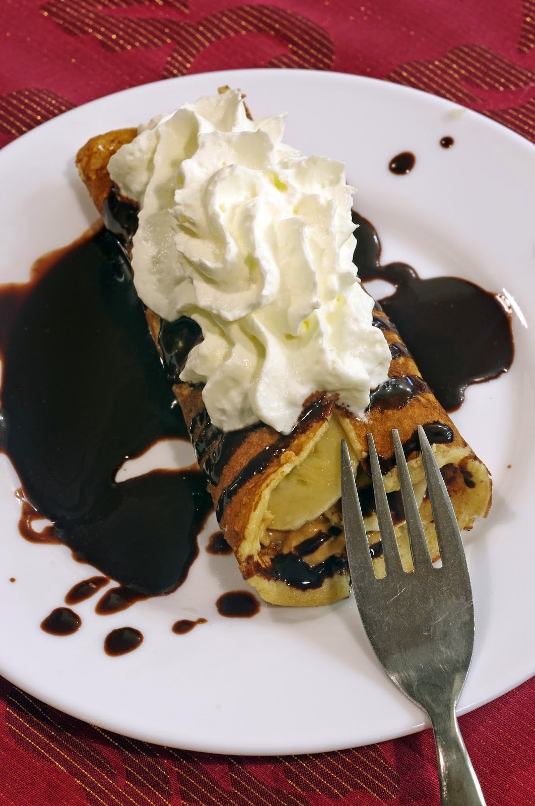 4. A palacsintát megkenjük mogyoróvajjal, megtöltjük banánkarikákkal, csokiszósszal meglocsolva, tejszínhabbal tálaljuk.