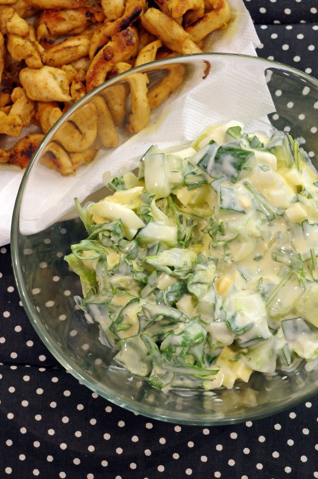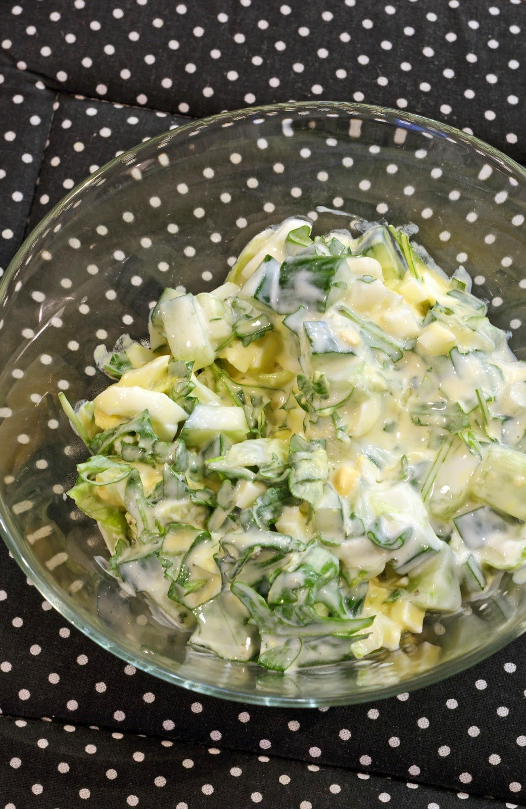 2. Egy tálban a joghurtot kikeverjük a mustárral, sózzuk. Hozzáadjuk a kisebb darabokra felvágott salátalevelet, ruccolát, felkarikázott újhagymát,felkockázott uborkát, végül beleforgatjuk a kihűlt tojáskockákat. Tálalásig hűtőbe tesszük.