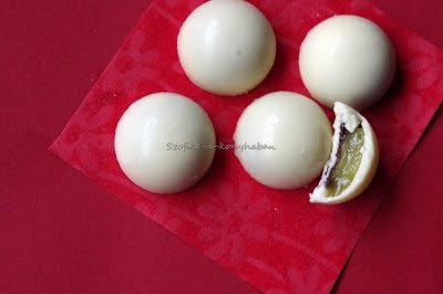 3. Ha a burok megkötött és a csokikrém is lehűlt, betöltjük a bonbonokat: először a citromkrémet töltöm egy kis zacsiba, aminek a végén lyukat vágok és minden bonbonba töltök. Ezután a csokikrémmel is hasonlóképp járok el. Újabb félóra a hűtőben.