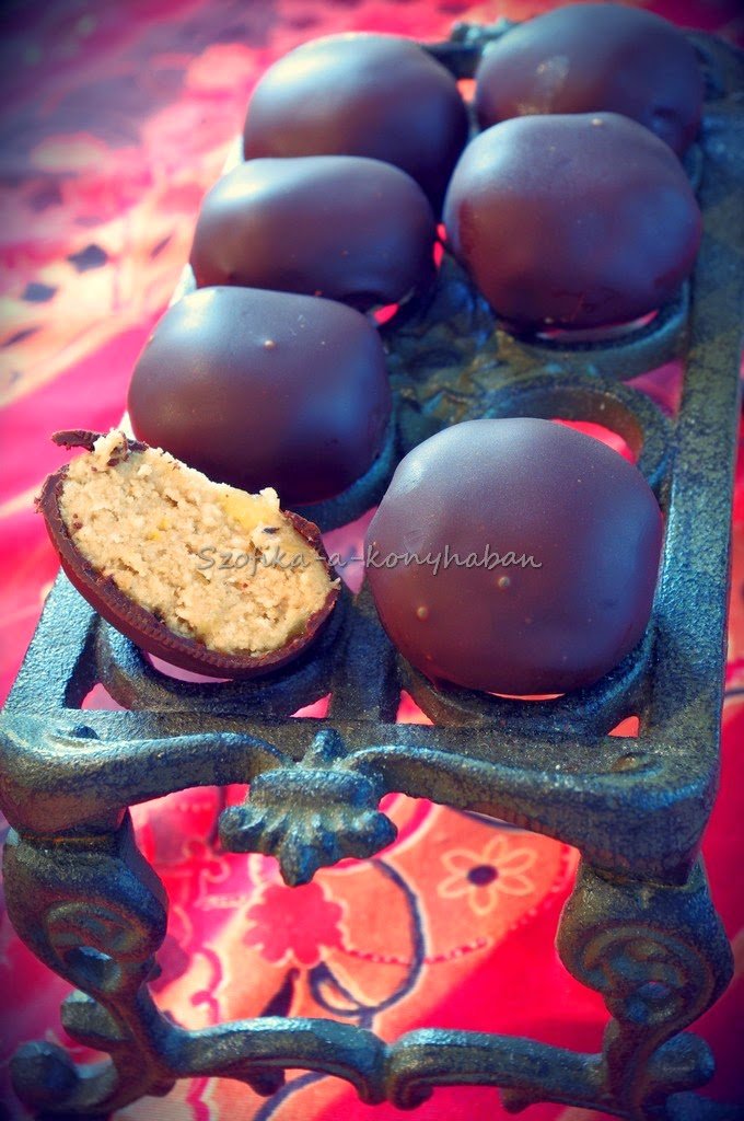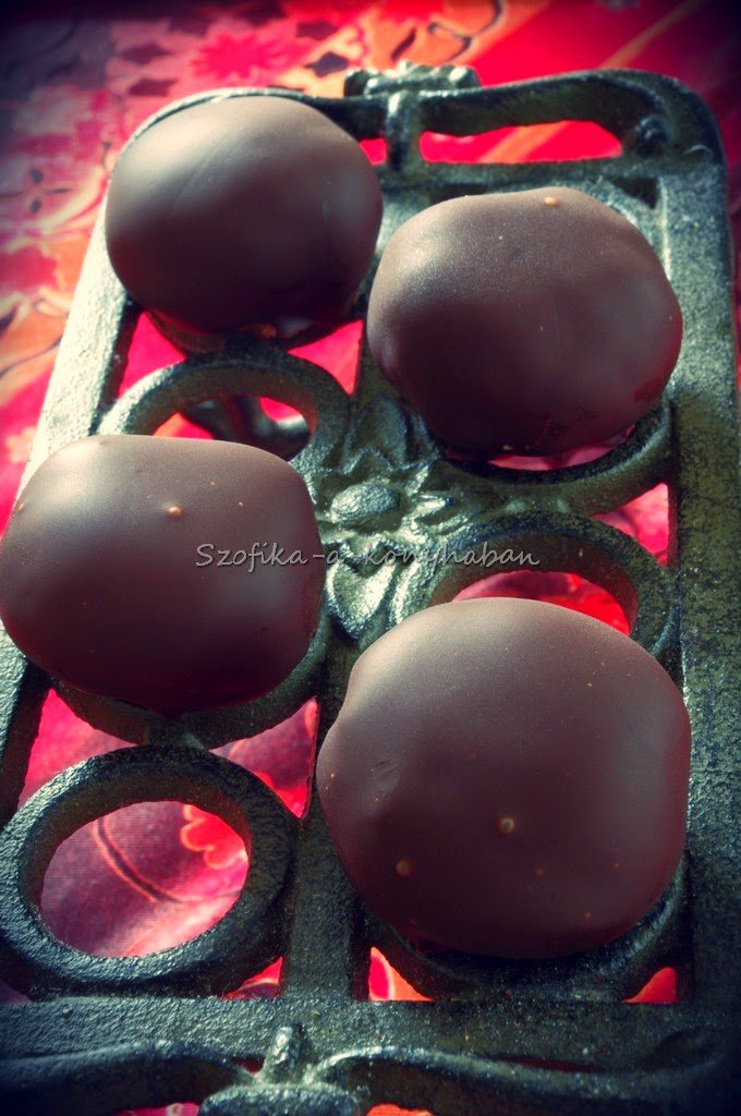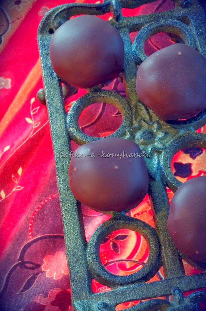 3. Az étcsokit mikróban felolvasztjuk, ha nem elég híg, adunk hozzá pici étolajat. Ebben mártjuk meg a golyókat, sütőpapírra tesszük őket. Mivel a golyó hideg, 1 perc alatt rá fog kötni a csoki. Fogyasztásig tegyük vissza a fagyasztóba, de legalábbis a sima hűtőbe, hogy jó hideg legyen és masszív.