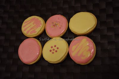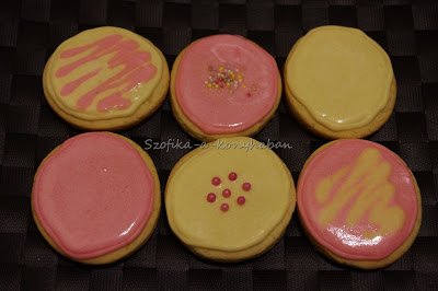 Ezúttal a legegyszerűbb alakzatot választottam: kör.A tetejére pedig a Mohi által etalonnak tartott tojásfehérjés cukormáz került. De hogy ne legyen uncsi, a tésztáját egy kis rózsavízzel és citromhéjjal azért megbolondítottam.