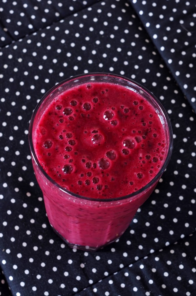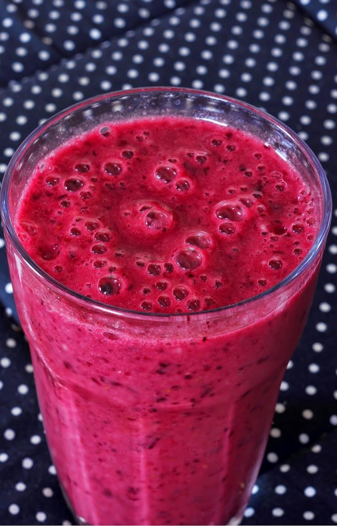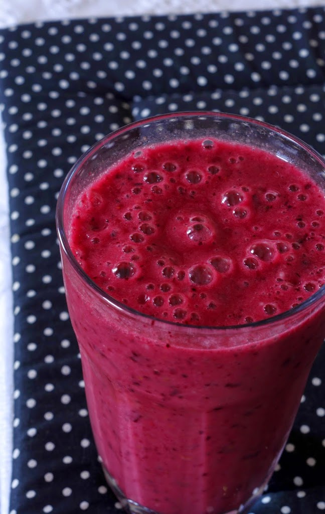 2. A banánnal és a bogyós gyümölcsökkel együtt turmixgépbe tesszük és alaposan összedolgozzuk.