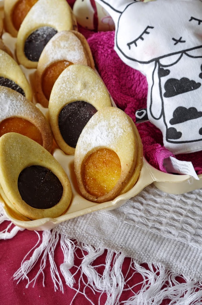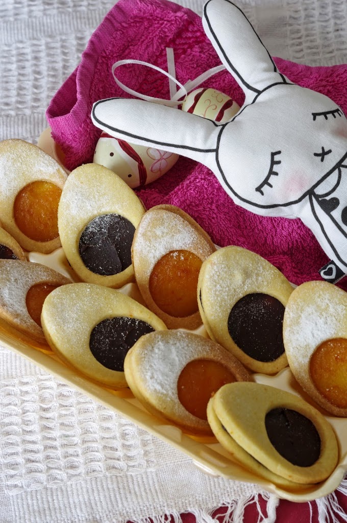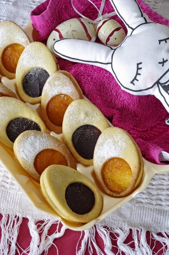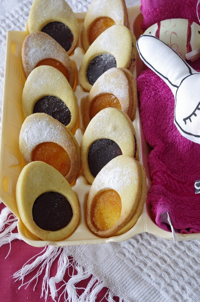 6. When the cookies are cooled down dust with icing sugar the eggs with a hole and using the chocolate cream or orange jam stick them together. Keep in an airtight container they will last up to weeks.