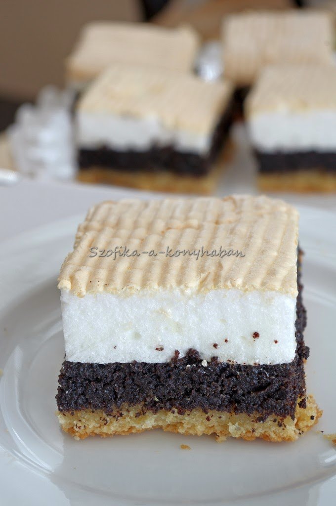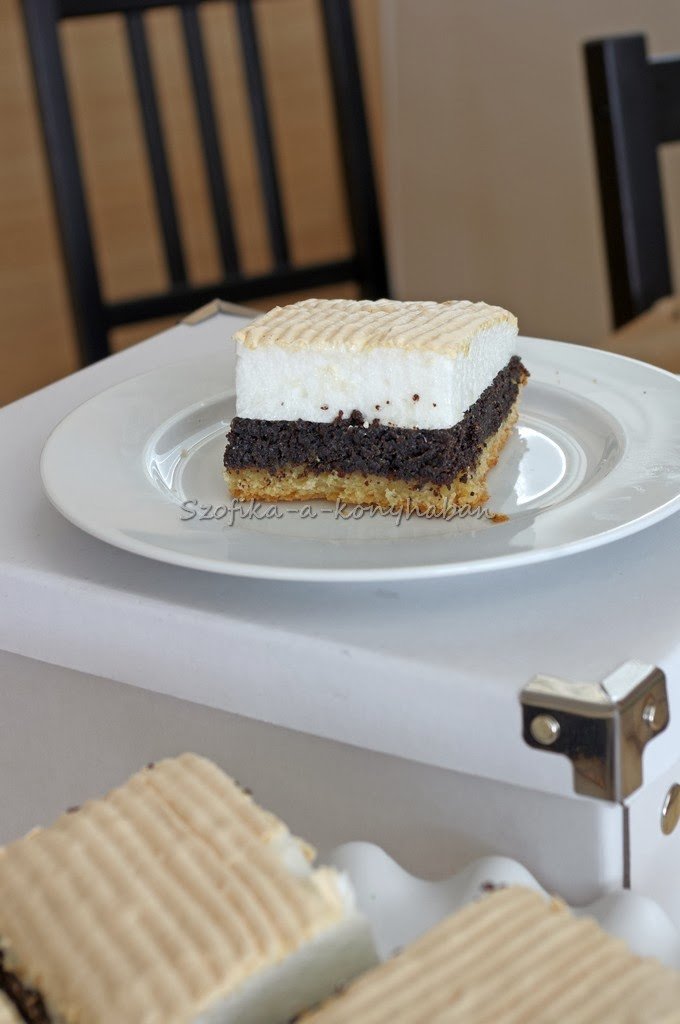 4. A tojások fehérjét kemény habbá verjük majd evőkanalanként hozzáadagoljuk a cukrot, miközben folyamatosan verjük a habot. Fényes, sűrű, vágható masszát kell kapnunk. A mákos réteg tetejére simítjuk és további 15 percre visszatoljuk a sütőbe. Mikor kezd egy kis színt kapni a teteje, már vesszük is ki.